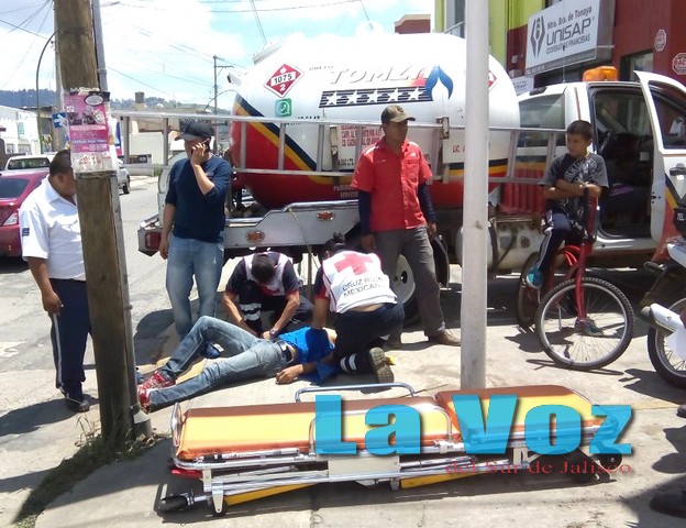 CIUDAD GUZMÁN, JAL., (ES).- Justo en la entrada de una fraccionamiento que se ubica sobre la calle Primero de Mayo, a unos metros de la calle Efraín Buenrostro, se registró un accidente en el que participaron una motocicleta con razón social de un negocio de comida rápida, conducida por Víctor Hugo Contreras de 27 años vecino de la calle Federico del Toro, y una pipa de gas LP.