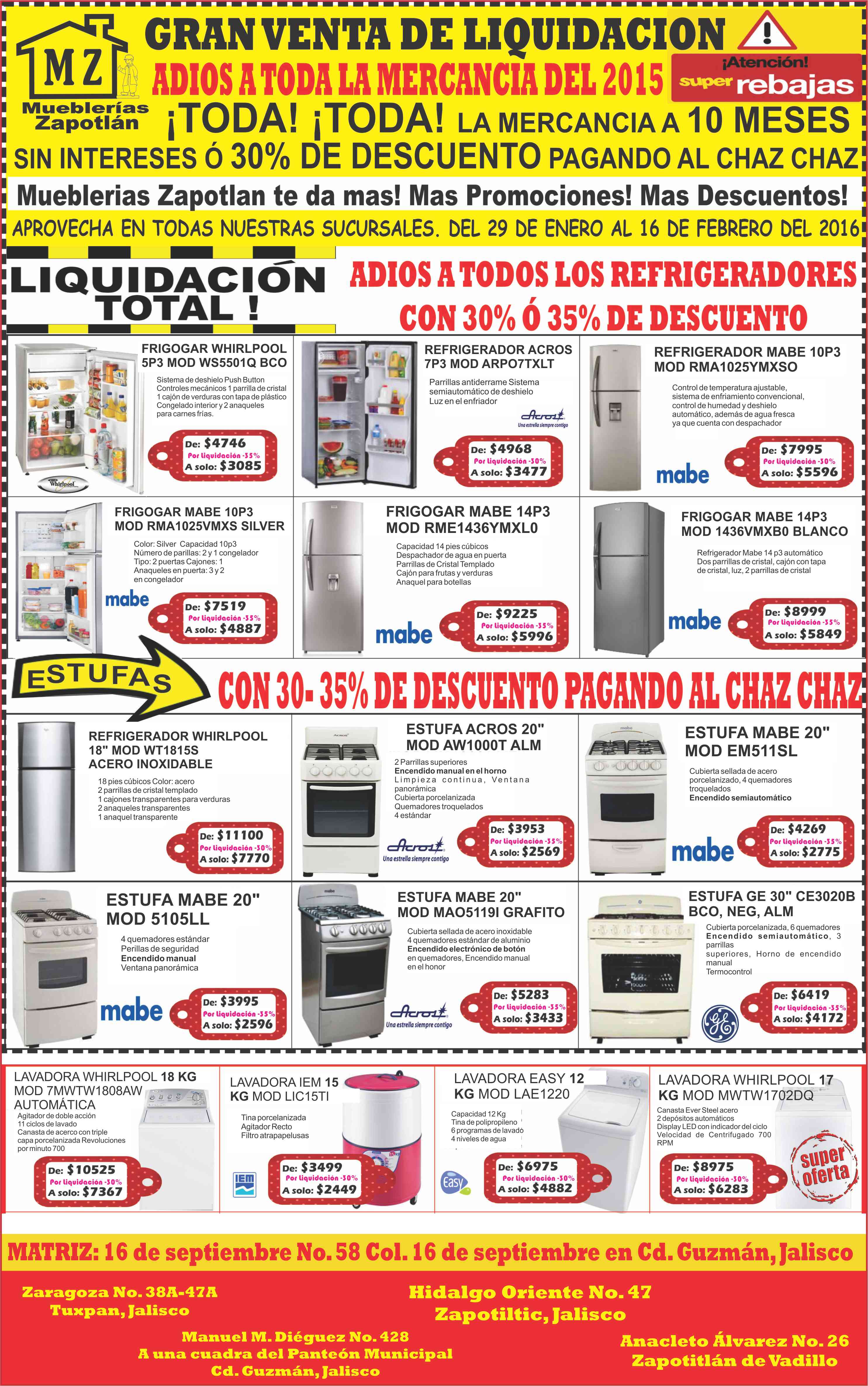 Promociones Published on febrero 7th, 2016 | by lavozsur 0 ¡Adiós a toda la mercancía de 2015 en Mueblerías Zapotlán! Related posts: Estrena celular con las mejores promociones de CelularBeep Por aniversario, grandes descuentos en Expo Lámparas Con $10.00 llévate un kilo de azúcar en Mamá Coneja About the Author lavozsur Con 35 años de trayectoria, somos el periódico número 1 en información y análisis de la región Sur de Jalisco. Related Posts Asalto a Camión de Carga en la Autopista Deja un Muerto y Provoca Movilización → Empleado de una Empacadora Pierde la Vida al ser Atropellado en el Crucero del Zapote → Conjunto Garantía Norteña Estrena el Sencillo “Vámonos a Amar” → Banda Saucillos Celebra 24 Años de Éxitos y Actividad Ininterrumpida → Deja un comentarioTu dirección de correo electrónico no será publicada. Los campos obligatorios están marcados con *Comentario * Nombre * Correo electrónico * Web Guardar mi nombre, correo electrónico y sitio web en este navegador para la próxima vez que haga un comentario. Δ