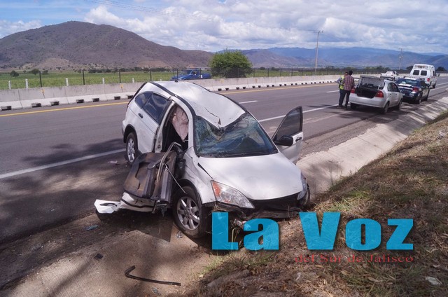 TUXPAN, JAL., (ES).- Dos personas lesionadas y cuantiosos daños materiales fue el saldo que dejó la volcadura de un vehículo utilitario sobre el kilómetro 102 de la autopista Guadalajara-Colima.