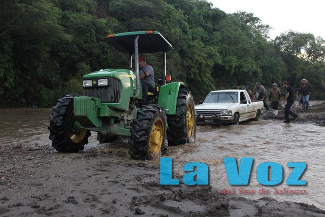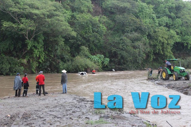 TUXPAN, JAL., (ES).- Personal de la Unidad Municipal de Protección Civil de Tuxpan prestaron apoyo a un automovilista y tres trabajadores que al intentar cruzar el río Tizatirla fueron arrastrados por la corriente. Los hechos ocurrieron el lunes 7 de julio cuando el personal de Protección Civil recibió el reporte donde se informaba que un vehículo estaba siendo arrastrado por la corriente, por lo que de inmediato se trasladaron a la orilla del río donde encontraron una camioneta Toyota en color blanco y con placas de circulación JC-08267 del estado de Jalisco, que estaba prácticamente cubierta por el agua. Se informó que el conductor de la unidad quien viajaba acompañado de tres trabajadores, intentó cruzar el río a pesar de que la fuerza de la corriente era evidente, por lo que al ingresar al agua se dieron cuenta que la unidad estaba siendo arrastrada, por lo que de inmediato bajaron y se pusieron a salvo, mientras que la camioneta quedó unos 300 metros río abajo. Por ese motivo el personal de Protección Civil ayudó a asegurar el vehículo mientras que el propietario consiguió un tractor para poderlo sacar del agua, aunque seguramente los daños serán considerables.