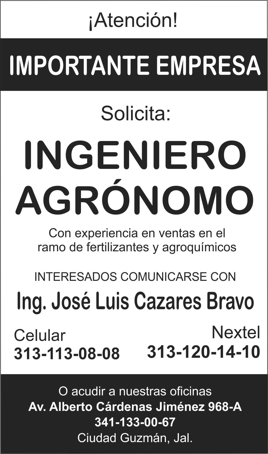 Bolsa de Trabajo Published on enero 24th, 2016 | by lavozsur 0 Bolsa de Trabajo. Se solicita Ingeniero Agrónomo Related posts: Se solicitan gestores de crédito Importante empresa solicita chofer con licencia federal La Marina te invita a unirte a su equipo de trabajo About the Author lavozsur Con 35 años de trayectoria, somos el periódico número 1 en información y análisis de la región Sur de Jalisco. Related Posts Reparto de utilidades BIMBO 2016, a partir del 1 de junio → Únete al equipo de asesores de Consol Negocios → Aceros Murillo solicita chofer → Empresa líder solicita vendedor con experiencia en el ramo agroindustrial → Deja un comentarioTu dirección de correo electrónico no será publicada. Los campos obligatorios están marcados con *Comentario * Nombre * Correo electrónico * Web Guardar mi nombre, correo electrónico y sitio web en este navegador para la próxima vez que haga un comentario. Δ