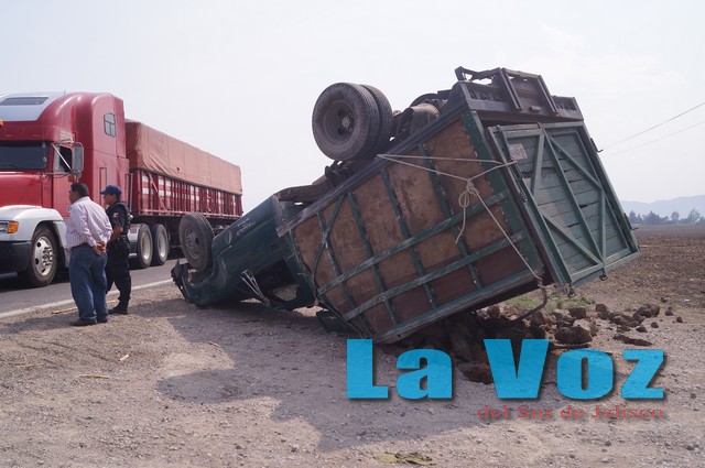 El percance ocurrió después de que una camioneta de 3.5 toneladas que transportaba piedra circulaba de El Mirador con rumbo a Zapotiltic, pero poco antes de llegar al puente de La Tolteca, su conductor salió ligeramente del carril y debido a la falta de acotamiento en esta vía, perdió el control ocasionando que volcara quedando sobre su toldo.