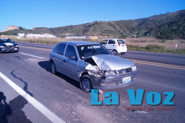 ZAPOTILTIC, JAL., (ES).- Sólo daños materiales dejó el choque entre cuatro vehículos en la carretera Ciudad Guzmán-Zapotiltic. Fue la mañana del martes 19 de noviembre cuando los cuerpos de emergencia municipales fueron alertados sobre el choque múltiple a la altura del Cerrito de la Virgen, por lo que de manera inmediata se trasladaron al lugar elementos de seguridad pública de Zapotiltic, quienes a su llegada se encontraron un Pointer, una camioneta Ford Escape, una Toyota de modelo atrasado y una Nissan Estacas, los cuales se habían impactado entre si. De acuerdo a versiones de los conductores, uno de ellos perdió la visibilidad por el sol, lo que provocó que se impactara con el auto que iba adelante de él, ocasionando la carambola. Pese a lo aparatoso del accidente no hubo personas lesionadas salvo una mujer que sufrió una crisis nerviosa. Elementos de la Policía Federal tomaron conocimiento de los hechos para deslindar responsabilidades.