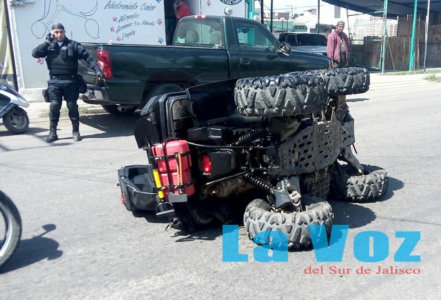 CIUDAD GUZMÁN, JAL., (ES).- Con lesiones mínimas resultó el conductor de una cuatrimoto la tarde del miércoles 21 de octubre en las confluencias de la calle Mariano Abasolo y Guillermo Jiménez, en la colonia Villas de Calderón.