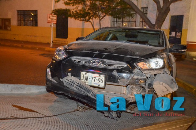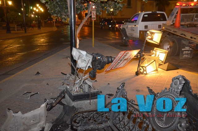CIUDAD GUZMÁN, JAL., (ES).- Un imprudente conductor que por manejar a exceso de velocidad perdió el control de su automóvil, derribó una lámpara ubicada en pleno Centro Histórico de la ciudad.