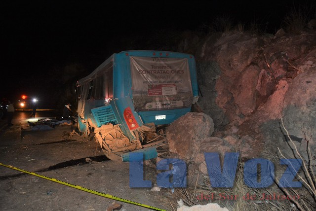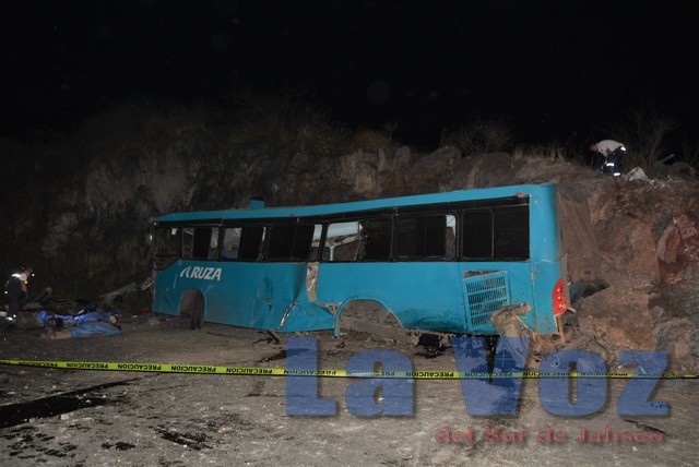 TUXCUECA, JAL., (ES).- Un autobús de pasajeros que transportaba a trabajadores agrícolas de Mazamitla a Jocotepec se accidentó en el tramo carretero que comunica a Tuxcueca con Teocuitatlán de Corona dejando un saldo de 14 personas muertas y 19 lesionadas.