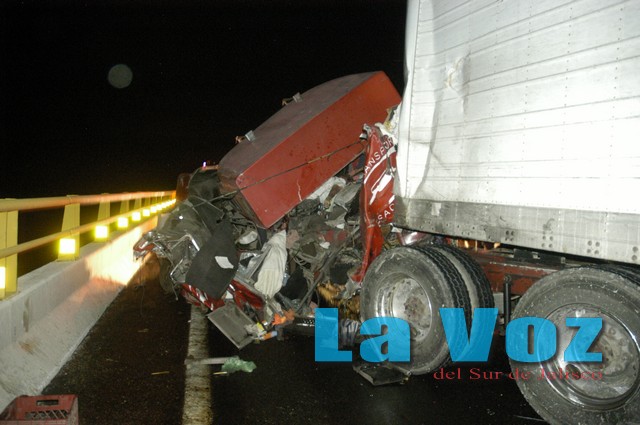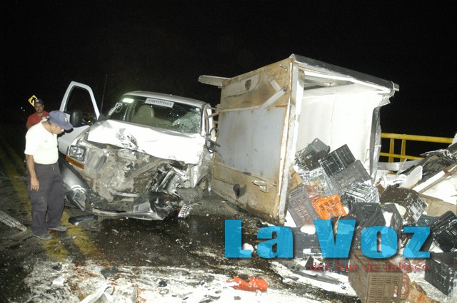TONILA, JAL., (ES).- Una persona murió y otra más resultó seriamente lesionada como consecuencia de un aparatoso accidente registrado en el puente Beltrán de la autopista Guadalajara-Colima. El percance tuvo lugar la noche del miércoles 20 de mayo en el kilómetro 119 más 900 de la autopista Guadalajara-Colima, en la parte intermedia del puente Beltrán. Tras el reporte, personal de la Unidad estatal de Protección Civil y Bomberos de Jalisco, así como elementos de la Policía Federal Preventiva, rescatistas de Protección Civil de Tuxpan y Tonila se trasladaron al sitio del percance, donde encontraron que un trailer se había impactado contra una camioneta. Se trata de un camión marca Internacional en color rojo y con placas de circulación 540DP1 del Servicio Público Federal que era conducido por Raúl Domínguez Montes, quien era vecino de Ocotlán y perdió la vida al quedar prensado en el interior de la unidad. Dicha unidad se impactó con una camioneta Ford F250 en color blanco, modelo 1999 y con placas de circulación JR-09583 del estado de Jalisco conducida por Raúl Córdoba Godínez de 52 años y vecino de San José de Gracias, quien resultó lesionado al igual que su acompañante Gerardo Chávez Valadez de 19 años. Se pudo saber que ambas unidades circulaban con dirección de Colima hacia Guadalajara, pero en determinado momento la camioneta Ford que transportaba productos lácteos intentó rebasar al camión de carga en el puente Beltrán, pero al parecer sufrió una falla mecánica y se impactó con el trailer, al cual le cayó encima la caja fría de la camioneta, provocando que el conductor quedara prensado y en pocos minutos perdiera la vida debido a la gravedad de sus lesiones. Como consecuencia de este aparatoso accidente, de nueva cuenta la autopista quedó cerrada en ambos carriles de circulación por espacio de siete horas, lo que ocasionó largas filas de vehículos.
