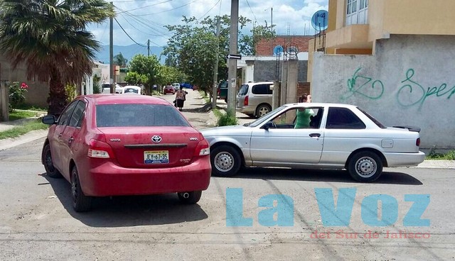 Paramédicos de la Cruz Roja arribaron poco antes de las 14:00 horas a los cruces de las calles Antonia del Toro y San Carlos, sitio donde un Toyota Yaris rojo modelo 2007 y un Nissan Tsuru con placas JCD 1113 modelo 1992, protagonizaron un choque.