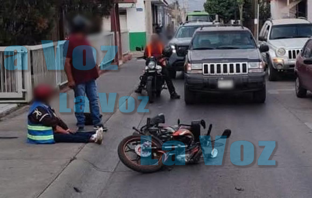 CIUDAD GUZMÁN, JAL., (ES).– La tarde del lunes 20 de abril se registró un accidente vial sobre la calle Moctezuma, entre Independencia y Pascual Galindo, donde un automóvil y una motocicleta colisionaron, dejando como saldo a una mujer lesionada.
