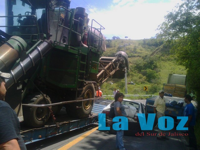 En el percance participaron un camión con plataforma que transportaba una trilladora, un tráiler con una plataforma de tarimas y con camión de carga con redilas, así como un automóvil compacto del cual sus tripulantes milagrosamente salvaron la vida ya que sólo uno de ellos resultó con lesiones menores.