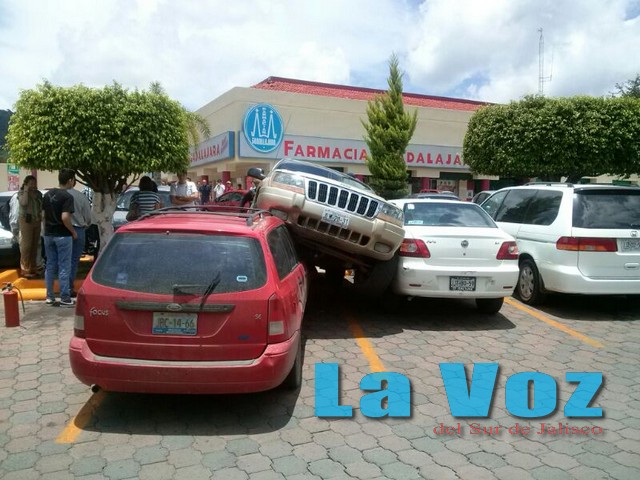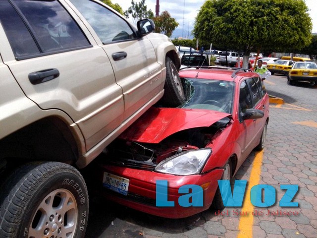 CIUDAD GUZMAN, JAL., (ES).- Tremendo susto se llevaron los clientes de Plaza Zapotlán luego de que una mujer que manejaba una camioneta utilitaria provocara un aparatoso accidente que dejó cuantiosos daños materiales. El aparatoso accidente se registró la tarde del domingo 29 de junio en el estacionamiento de Plaza Zapotlán, cuando la señora Estela Martínez Puerta, vecina de la colonia Constituyentes, metió el acelerador de su vehículo a fondo y brincó los machuelos del cajón del estacionamiento que además le sirvieron de rampa, por lo que su camioneta Jeep, Gran Cherokee, en color café y con placas JLM 20 31, quedó sobre dos vehículos, uno de los cuales sufrió daños de mayor cuantía. Los otros autos involucrados fueron un Fiat, Palio, placas JJT 80 59 y un Ford, Focus, placas JBC 14 66 de Jalisco, cuyos propietarios se llevaron una tremenda sorpresa al regresar de compras y ver lo que ocurría. Al sitio acudieron paramédicos de la Cruz Roja, cuya intervención no fue necesaria, y oficiales de Tránsito Municipal que dieron el seguimiento legal al hecho con la finalidad de deslindar responsabilidades.