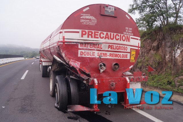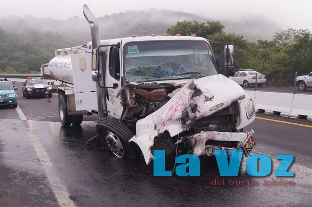 SAYULA, JAL., (ES).- Cuantiosos daños materiales y el cierre parcial de la autopista fue el resultado del choque de dos pipas.Los hechos ocurrieron la mañana del miércoles a la altura del kilómetro 68 en la Cuesta de Sayula, después de que una pipa que transportaba 29 mil litros de combustóleo con dirección a Colima fue impactada en la parte trasera por otra pipa con capacidad para once mil litros de gasolina misma que quedó completamente destrozada en la cabina.