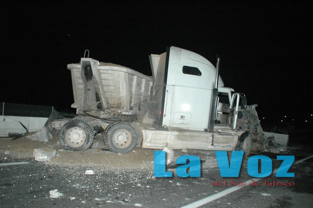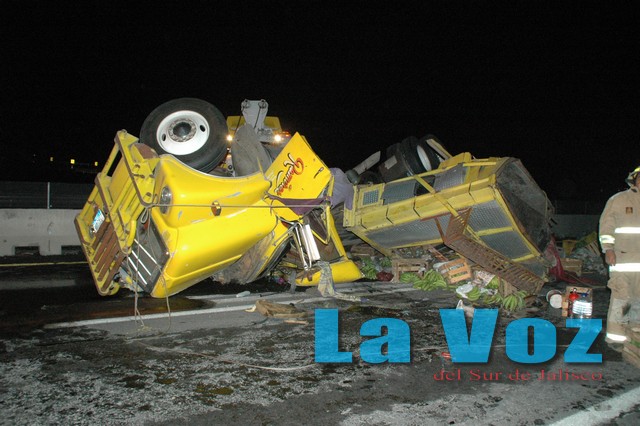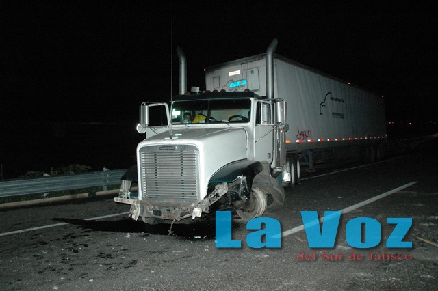 SAYULA, JAL., (ES).- Intensa movilización de unidades de emergencia, una persona lesionada y el cierre de la autopista en sus dos sentidos por varias horas fue el saldo que dejó el choque de tres camiones de carga la madrugada del miércoles 24 de julio. El percance tuvo lugar el miércoles 24 de julio alrededor de las tres de la mañana, cuando se reportó que en el kilómetro 67 de la autopista varios trailers se habían impactado. De inmediato personal de la Unidad Estatal de Protección Civil, Cruz Roja Mexicana, Policía Federal Preventiva y mantenimiento carretero se trasladaron al crucero de Usmajac, donde encontraron un verdadero caos por los despojos y mercancía regada, por lo que se optó por cerrar la carretera en ambos sentidos. De acuerdo a los peritajes preliminares se estableció que un camión tipo torton, Dina, placas JE 54 499, con la palabra Ramírez en las puertas de la cabina, que transportaba un cargamento de plátano, circulaba en dirección a Guadalajara; cuando estaba a punto de salir de la Cuesta de Sayula, el conductor, Francisco Javier Rodríguez Enríquez, de 46 años de edad, con domicilio en El Rebalsito, municipio de La Huerta, perdió el control del volante y la unidad a gran velocidad se impactó en el muro central de contención, alcanzando a chocar con una góndola que cargada con arena transitaba con dirección a Colima. Esta unidad con razón social de Transportes Banderas, quedó obstruyendo los carriles de alta velocidad en ambos sentidos, el chofer no sufrió lesiones. El tercer involucrado fue un tráiler Freightliner, que circulaba de Colima a Guadalajara, cuyo conductor de pronto se encontró en el carril con los fragmentos de concreto del muro de contención, sufriendo daños en la suspensión, motor y llantas, por fortuna su conductor también resultó ileso. El único lesionado en este aparatoso accidente fue el conductor del camión que transportaba plátanos, quien quedó atorado en el interior del camión pero fue rescatado y llevado a un hospital para que recibiera atención médica. La carga de plátano se esparció en un tramo de más de 200 metros de longitud, cubriendo ambos carriles, por lo que el personal de mantenimiento carretero trabajó por varias horas para reestablecer la circulación vehicular.