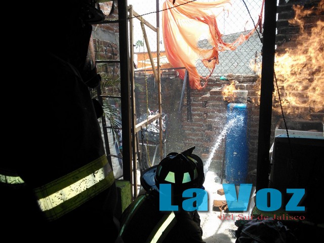 SAYULA, JAL., (ES).- Tremendo susto y gran alarma entre los vecinos, provocó el incendio de un cilindro de gas al interior de un domicilio en el municipio de Sayula. Fue la tarde del sábado 12 de julio cuando la Unidad Municipal de Protección Civil recibió el reporte del incendio por lo que de inmediato se trasladaron hasta la calle Fray Juan de Bolonia quienes a su llegada encontraron el cilindro encendido y parte de una habitación con severos daños. Los traga humo comenzaron a enfriar el cilindro con el apoyo de agua y tras varios minutos uno de los bomberos pudo acercarse al tanque para cerrar la llave de paso del gas. Se supo que el siniestro tuvo su origen en la manguera que no era la indicada para este tipo de combustible. Una vez que el fuego estuvo controlado, los rescatistas se dieron cuenta de que en el interior del domicilio se reportaron cuantiosos daños materiales ya que se quemaron una lavadora, una lona, parte de la cocina y el corral además de varias prendas de vestir.