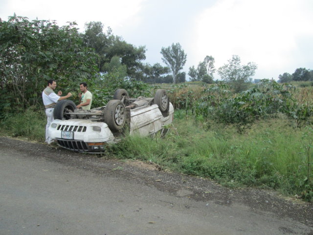 En el sitio se localizó una camioneta Jeep Cherokee en color blanco y con placas de circulación JJD-4951 del estado de Jalisco, la cual se dijo que era conducida a exceso de velocidad y sumado a ello la cinta asfáltica en esa zona presenta un serio deterioro, por lo que el conductor perdió el control y se volcó.