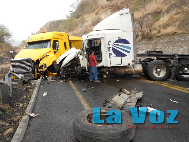 TUXPAN, JAL., (ES).- Cuantiosos daños materiales, el cierre de la autopista por varias horas y una persona gravemente herida fue el saldo que dejó el choque de frente entre tres camiones de carga. Los hechos ocurrieron la mañana del sábado 18 de mayo sobre el kilómetro 113 de la autopista Guadalajara-Colima, donde se reportó el choque de tres camiones de carga, lo que provocó una intensa movilización de unidades de emergencia. Personal de Protección Civil del estado, policías municipales, oficiales de la Policía Federal Preventiva y rescatistas de protección Civil de Tuxpan se trasladaron al sitio, donde encontraron a los tres camiones impactos y una persona gravemente lesionada. Se trata de un camión marca Columbia en color blanco y con placas de circulación 80-UR3-4 que era conducido por el señor Eduardo Cuevas Mendoza, de 34 años de edad y quien fue trasladado en estado grave a un hospital en Ciudad Guzmán por personal de la Cruz Roja guzmanense. También participó un camión marca Kenworth en color blanco con placas 959-AP-7 del Servicio Público Federal conducido por Roberto Carlos Lara de 36 años y quien resultó ileso. Otro de los camiones participantes fue un tracto camión marca Freighliner amarillo con placas 724-WP6 del Servicio Público Federal conducido por Jesús Flores Solís de 56 años y quien también resultó ileso. Las primeras investigaciones revelaron que el conductor del primer camión intentó realizar un rebase pero no alcanzó y se impactó de frente con otro camión, el cual a su vez chocó con otra unidad de transporte de carga, provocando un fuerte derrame de combustible lo que ocasionó el cierre de la autopista por varias horas.