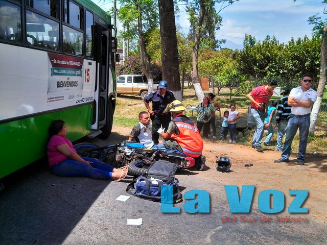 CIUDAD GUZMAN, JAL., (ES).- La imprudencia de los motociclistas y los cafres de los Autobuses Urbanos Guzmanense se conjugó provocando un accidente que dejó un saldo de dos personas lesionadas.
