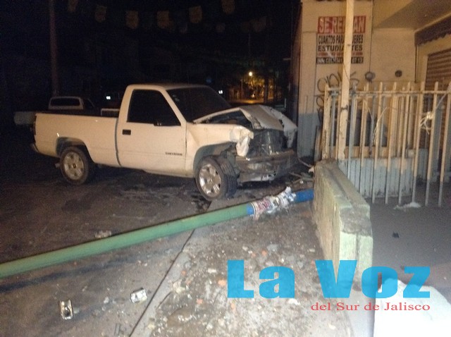 CIUDAD GUZMÁN, JAL., (ES).- La imprudencia y el exceso de velocidad, provocaron que el conductor de una camioneta chocara contra un poste alumbrado público y contra dos fincas de la calle Ramón Corona.
