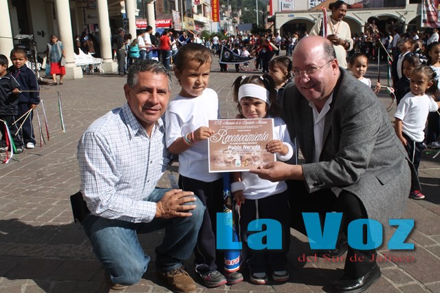 Con la participación de niños de los diferentes preescolares del municipio, dio inicio el desfile cívico deportivo el pasado martes 19 de noviembre para conmemorar el 103 aniversario de la Revolución Mexicana. En esta ocasión, el desfile fue encabezado por el presidente municipal, Francisco Javier Álvarez Chávez y cuerpo edilicio, al igual que personal docente y padres de familia que se dieron cita en el lugar, para presenciar la marcha. En el desfile participaron 15 contingentes de diferentes preescolares, además de carros alusivos a la par realizaron presentaciones con beneplácito de adultos, jóvenes y niños que en muchos casos portaban atuendos de “Valentinas” y “Adelitas”, así como de personajes alusivos a héroes revolucionarios. Para culminar con el acto, Álvarez Chávez entregó reconocimientos a cada uno de los jardines de niños participantes y mencionó que “en las actuales circunstancias históricas, de reformas y compromisos, reitero la responsabilidad del gobierno que presido para continuar apoyando y reconociendo la trascendencia del trabajo que realizan las educadoras, debido a que inculcan infinidad de valores en los niños para que aprendan a ser mejores, viviendo en armonía con la sociedad y la naturaleza”.