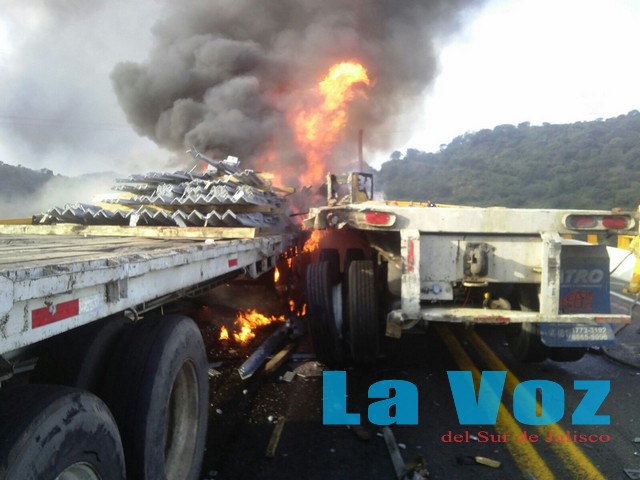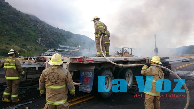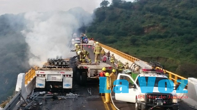 TUXPAN, JAL., (ES).- Intensa movilización de unidades de emergencia se registró en el kilómetro 109 de la autopista Guadalajara-Colima al presentarse un choque múltiple a la altura del Puente Atenquique II donde dos camiones de carga fueron consumidos por el fuego.