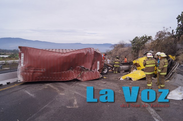 SAYULA, JAL., (ES).- Saldo de una persona herida de gravedad y el cierre de la autopista en dirección a Guadalajara, fue el resultado de la volcadura de un tráiler.