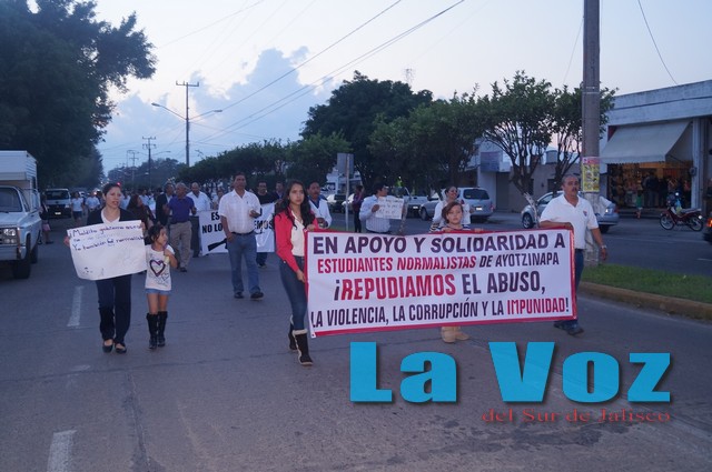 CIUDAD GUZMÁN, JAL, (ES).- Alrededor de 600 profesores y alumnos del Centro Regional de Educación Normal (CREN) de Ciudad Guzmán, marcharon pacíficamente la noche del miércoles 8 de octubre con el fin de manifestar su apoyo y pedir justicia para los estudiantes desaparecidos y asesinados en Ayotzinapa, comunidad del estado de Guerrero.