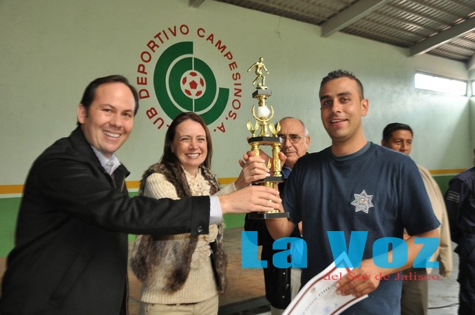 Para concluir el festejo social y familiar del policía municipal, el alcalde José Luis Orozco Sánchez Aldana y su esposa Mónica Reynoso entregaron reconocimientos y trofeos a los cuatro equipos que participaron en el triangular de fútbol realizado en su día.
