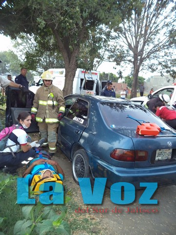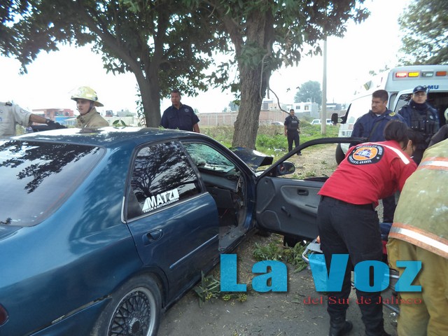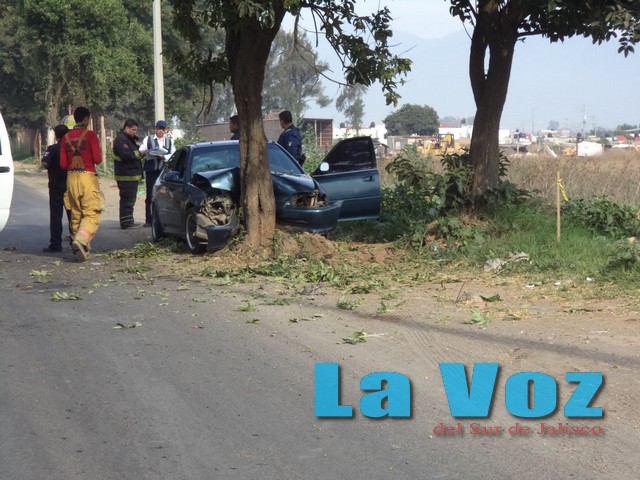 CIUDAD GUZMÁN, JAL., (ES).- Tres personas resultaron lesionadas después de que el auto en el que viajaban se impactó fuertemente contra un árbol en la calle Bravo, casi en su cruce con Guerrero.