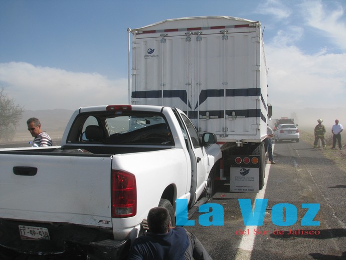 Los hechos se registraron la tarde del jueves 11 de abril a la altura del kilómetro 45 en los carriles con dirección a Colima, después de que los fuertes vientos que se registraron en la zona ocasionaron una serie de tolvaneras que acompañadas del humo de los incendios de pastizal, obstruyeron la visibilidad por lo que un camión Kenworth en color blanco se impactó en la parte trasera de un trailer que se dio a la fuga.