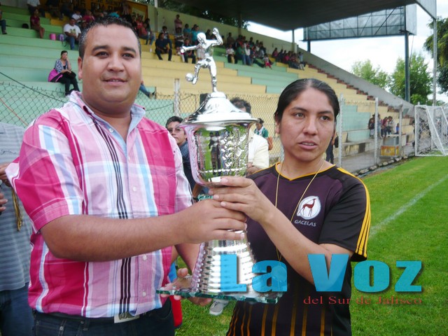CIUDAD GUZMAN, JAL., (ES).- Un buen partido resultó el encuentro de la gran final del futbol femenil entre los equipos de Gacelas de Sayula y Palomas de Tuxpan. Eran las 17:40 horas cuando el árbitro dio el silbatazo inicial para las acciones de esta final. El público asistente a este encuentro se veía satisfecho ya que los equipos desde los primeros minutos de juego buscaron la ventaja en el marcador. Fueron las Palomas las que sobre el minuto cinco estrellaron el esférico en el travesaño por conducto de Karla Ramírez. Respondieron rápidamente las “cajeteras” de Sayula por mediación de Luz Elena Acosta Coronel, quien recibió el esférico en la media cancha, se quitó a una jugadora de las Palomas, pero atrás estaba Castellanos Castrejón, quien despojó del esférico a Luz Elena, cedió para Adriana Castellanos en la media cancha y esta prolongó hasta el lado derecho donde se encontraba Karla López, quien mandó su tiro el cual pasó rozando el travesaño. Sobre los treinta y ocho de la primera mitad, cuando el árbitro estaba por mandarlas al descanso, vino por el lado izquierdo Luz Elena Acosta Coronel, quien enfrentó a la portera de Palomas, la cual dejó descubierto el lado izquierdo de su arco y por ahí anotó la delantera de Gacelas el 1-0. Así terminó el primer tiempo. Para la parte complementaria, al silbatazo se vino la lluvia. Esto provocó que las jugadoras de las Palomas vinieran a la baja en su rendimiento deportivo, mientras que las Gacelas aprovechaban los espacios que les dejaba el rival. Sobre el minuto veinticinco vino el segundo gol de las “cajeteras”, quienes sobrellevaron las acciones del resto del encuentro hasta el silbatazo final, proclamándose de esa forma campeonas de copa en la liga femenil de Ciudad Guzmán En el encuentro por el tercer lugar entre las “cañeras” de la sección 80 de Tamazula contra el Manchester, el resultado favoreció 3-2 a las pupilas de Juan Torres. Para la entrega de trofeos y medallas, se contó con la presencia de Miguel Bonilla en representación de Marco Antonio Méndez Antillón, jefe de promotoría deportiva. Se tuvo también la presencia del presidente de la liga constituyentes y de la liga de veteranos, quienes entregaron las medallas al Manchester, Sección 80 y a las Palomas. A las Gacelas se les dio su trofeo y medallas.