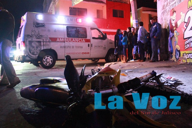 TUXPAN, JAL., (ES).- Con lesiones de consideración fue trasladado a la sala de urgencias del Hospital Regional un joven motociclista que se estrelló contra la parte frontal de un vehículo en movimiento. El accidente tuvo lugar el sábado cuatro de enero alrededor de las nueve y media de la noche en la confluencia de las calles Madero y Aquiles Serdán, donde se reportó el aparatoso accidente entre una motocicleta y un vehículo utilitario. De inmediato los rescatistas de la Unidad Municipal de Protección Civil de Tuxpan se trasladaron al sitio, donde encontraron tirada sobre la calle una motocicleta Suzuki en color amarillo que era conducida por Antonio de Jesús Mata Carrillo, de 19 años de edad y con domicilio en la calle Marcelino García Barragán de la cabecera municipal de Tuxpan. Dicha unidad se impactó contra una camioneta Ford Expedition en color tinto, por lo que el joven conductor de la motocicleta resultó gravemente herido, por lo que de inmediato fue enviado al Hospital Regional de Ciudad Guzmán para que recibiera atención médica ya que presentaba traumatismo en tórax y abdomen. Y es que en Tuxpan la imprudencia de los motociclistas ha provocado varios accidentes, pues horas antes, ese mismo sábado pero alrededor de las dos de la tarde, una motocicleta Carabela en color rojo que era conducida por José Luis Zúñiga Ureña de 48 años se impactó contra una bicicleta rodado 26 conducida por Cecilio Mancilla Chávez de 70 años, quien resultó gravemente herido y tuvo que ser trasladado al Hospital Regional debido a que presentaba fractura expuesta en tibia y peroné.