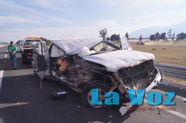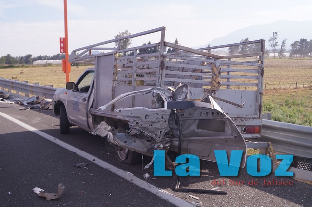 CIUDAD GUZMAN, JAL., (ES).- Dos personas lesionadas de gravedad y un vehículo totalmente destrozado fue el saldo que dejó un aparatoso accidente sobre la autopista Guadalajara-Colima. Fue la tarde del miércoles 12 de febrero cuando a la altura del kilómetro 88 con dirección de Colima una camioneta Ford Lobo en color blanco con placas de circulación FH 72282 del estado de Colima, conducida por Juan Manuel Magaña Chávez se impactó en la parte trasera de una Nissan Estacas en color gris la cual se encontraba detenida en el área de acotamiento después de que se le había ponchado una llanta. La camioneta Lobo modelo 2009 se impactó con el costado derecho, lo que ocasionó que la puerta quedara incrustada en la parte trasera de la camioneta Nissan, dando un giro posteriormente lo que ocasionó que el copiloto de nombre Antonio de Jesús Chávez Salado de 29 años de edad, saliera eyectado de la misma y quedara seriamente herido sobre la carretera. Hasta el lugar arribaron paramédicos de la Cruz Roja Mexicana y rescatistas de la Unidad Estatal de Protección Civil del Estado quienes prestaron los primeros auxilios a los tripulantes de la Lobo, quienes fueron trasladados a un hospital en Ciudad Guzmán en estado grave. Mientras tanto el conductor de la Nissan, identificado como Leonel Sánchez Silva, permaneció en el lugar sufriendo solo algunos rasguños y golpes en sus manos.