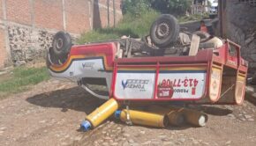 CIUDAD GUZMÁN, JAL., (ES).- La volcadura de una camioneta utilizada para la distribución de cilindros de gas provocó una intensa ;]