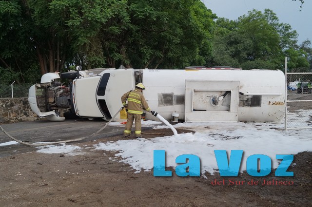 TUXPAN, JAL., (ES).- Intensa movilización de unidades de emergencia se registró en la carretera Tuxpan-Tamazula luego de que una pipa que transportaba 20 mil litros de gasolina se volcara y registrara un derrame de combustible. El percance se registró la tarde del viernes 28 de junio a la altura de San Mames, después de que una pipa que transportaba el combustible al municipio de Tamazula, sufriera el estallamiento de uno de los neumáticos traseros que a su vez reventó tres más lo que ocasionó que la pesada unidad volcara sobre su costado izquierdo. Debido al impacto con el pavimento el tanque se perforó lo que ocasionó un derrame importante de combustible lo que obligó al cierre total de la circulación a lo largo de toda la noche mientras bomberos de Tuxpan y Protección Civil del Estado trabajaron en la zona para contener el derrame de combustible que afectó parte de una parcela aledaña al lugar por lo que con el apoyo de maquinaria se tuvo que crear un dique para evitar que la gasolina corriera hasta el río Tuxpan.