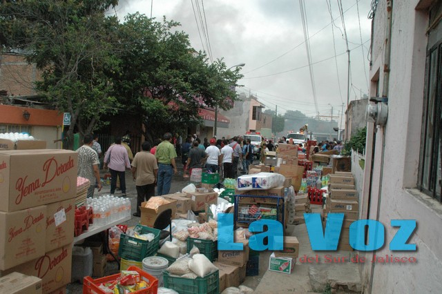 CIUDAD GUZMAN, JAL., (ES).- Intensa movilización de unidades de emergencia y cuantiosos daños materiales, así como tres personas intoxicadas fue el saldo que dejó el incendio de una empresa abarrotera ubicada cerca del tianguis municipal. El siniestro tuvo lugar el sábado 8 de junio alrededor de las nueve y media de la mañana, cuando se reportó que en la finca marcada con los números 4 y 6 de la calle Maíz de la colonia 16 de Septiembre se estaba incendiado la bodega de una negociación. De inmediato se trasladaron al sitio los elementos de la Unidad Municipal de Protección Civil de Ciudad Guzmán y Zapotiltic, así como Bomberos de Zapotlán y personal de Protección Civil Jalisco, quienes de inmediato se dieron a la tarea de combatir el fuego en dos bodegas de 17 por 32 metros. Por más de dos horas los bomberos combatieron el incendio y evitaron que se propagara a las casas aledañas, mientras que empleados y propietarios de la abarrotera El Tianguis trataban de salvar la mercancía de las bodegas. Debido a la acumulación de humo en el interior del local, tres personas tuvieron que ser atendidas por paramédicos de la Cruz Roja guzmanense, y una más sufrió una crisis nerviosa. Cientos de curiosos se abarrotaron en las calles aledañas para observa las labores de rescate, mientras que numerosas personas se ofrecieron a ayudar para retirar la mercancía de las bodegas y guardarlas en domicilios cercanos. Más tarde se presentó en el sitio el alcalde José Luis Orozco, quien supervisó las labores que se realizaban para enfrentar la contingencia y felicitó a los bomberos por su desempeño, al tiempo que dio instrucciones a los directores de departamentos como Agua Potable y Aseo Público para que apoyaran a los propietarios de la empresa en las labores de limpieza y remoción de escombros. En el siniestro, se pudo observar como en forma coordinada trabajaron varias dependencias como Seguridad Pública, Tránsito Municipal, Cruz Roja, Protección Civil, SAPAZA y Servicios Públicos Municipales, que permanecieron en el sitio hasta ya entrada la tarde.