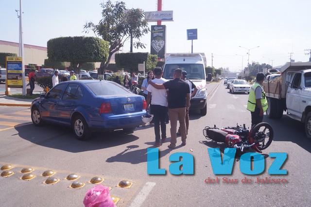 CIUDAD GUZMÁN, JAL., (ES).- Dos jóvenes que viajaban en una motocicleta resultaron con lesiones leves luego de chocar contra un auto compacto en uno de los ingresos de Plaza Zapotlán.