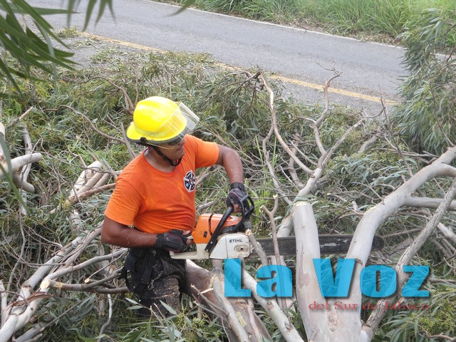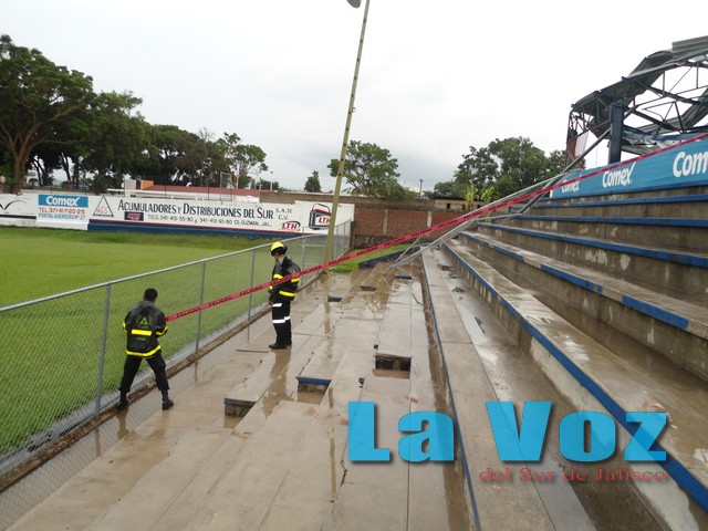 TUXPAN, JAL., (ES).- Las intensas lluvias registradas en los últimos días en nuestra región provocaron varios daños en el municipio de Tuxpan, donde incluso se reportó que el techo del estadio de fútbol fue derribado. La Unidad Municipal de Protección Civil informó que durante sus recorridos de vigilancia para prevenir accidentes fueron informados que en el Centro de Bachillerato Técnico Industrial dos árboles se habían caído sobre la barda perimetral, por lo que se acordonó la zona y procedieron a cortarlos. Mientras tanto, en el estadio municipal el techado de lámina fue deribado por el viento y cayó a espaldas de las gradas, por lo que el inmueble fue cerrado al público. Por otro lado en la colonia Guadalupana el techo de un rancho colapsó y también se tuvo que acordonar la zona. También acudieron al kilómetro 66 más 800 de la carretera libre Guadalajara-Colima, donde un enorme eucalipto fue derribado por elviento y obstruía los carriles de circulación, por lo que fue retirado con la ayuda de motosierras. También se reportaron árboles caídos e inundaciones en la barranca Santa María o colonia Guadalupana, colonia Paso Blanco, Talpita, Tierras Blancas, Fraccionamiento 21 de Marzo y la Colonia Vista Hermosa.
