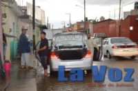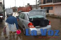 Un coche en color negro subió su parte frontal a la banqueta y el agua alcanzó hasta los asientos, igual con un auto Tsuru y un Tiida en color gris. El caso más grave se registró en la esquina de la calle Ramón Corona, donde un vehículo recorrió 20 metros mientras su dueña se resguardaba en un local comercial, vale la pena mencionar que la propietaria se quejó de los oficiales de Seguridad Pública, quienes en lugar de ayudarla a solucionar el percance, le pedían de forma prepotente que moviera su auto a la brevedad.