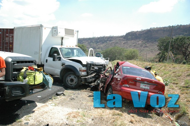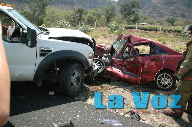 TONILA, JAL., (ES).- Dos personas murieron como consecuencia de un choque de frente en el kilómetro 115 de la autopista Guadalajara-Colima, donde la imprudencia de un camionero provocó el fatal accidente. El percance tuvo lugar el miércoles 12 de junio poco antes de las cuatro de la tarde, cuando se reportó que sobre el kilómetro 115 de la autopista Guadalajara-Colima, muy cerca del poblado de Platanar, se había registrado un choque de frente con saldo de dos personas muertas y cuantiosos daños materiales. De inmediato rescatistas de la Unidad Municipal de Protección Civil de Tuxpan y Zapotiltic, así como personal de Protección Civil Jalisco se trasladaron al sitio, donde encontraron un camión Ford F-450 en color blanco y con placas de circulación JN-71-127 del estado de Jalisco cuyo conductor, que fue el responsable del percance se dio a la fuga. Dicha unidad al intentar rebasar se impactó de frente con un automóvil Ford Focus en color tinto con placas de circulación FCY-80-85 del estado de Coahuila, el cual era conducido por el señor José Ricardo Estrada Quintero de 48 años de edad y con domicilio en la ciudad de Manzanillo, Colima. Se pudo saber que el camión que transportaba productos lácteos y carnes intentó rebasar e invadió el carril contrario, chocando de frente con el vehículo compacto. Debido a la fuerza del choque el conductor del auto Ford Focus perdió la vida en forma instantánea, mientras que su acompañante María Rita Avila Rangel de 50 años de edad resultó gravemente herida, por lo cual fue trasladada en una ambulancia de la Cruz Roja guzmanense a un hospital particular en Ciudad Guzmán. Posteriormente la mujer cuyo auto en que viajaba estaba asegurado y además debía contar con el seguro de la autopista, fue trasladada al Hospital Regional de Ciudad Guzmán debido a que el seguro de la autopista no alcanzaba a cubrir los gastos médicos en el hospital particular, y horas después se reportó su muerte. Para cubrir el accidente acudieron al sitio oficiales de la Policía Federal Preventiva, policías municipales de Tuxpan, rescatistas de Tuxpan y Zapotiltic, Protección Civil Jalisco, peritos del Instituto Jalisciense de Ciencias Forenses y el agente del Ministerio Público de Tuxpan.