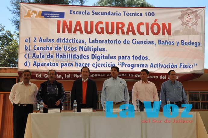 CIUDAD GUZMAN, JAL., (ES).- El Presidente Municipal de Zapotlán el Grande, José Luis Orozco Sánchez Aldana, y José Antonio Gloria Morales, Secretario de Educación en Jalisco, acompañados por demás autoridades educativas y del sector ejidal del municipio, inauguraron en la Escuela Secundaria No. 100: dos aulas didácticas, una de habilidades digitales, laboratorio de ciencias, baños, bodega, así como una cancha de usos múltiples y aparatos para hacer ejercicio, esto último dentro del programa “Activación Física”.