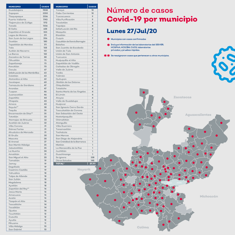 En la información proporcionada por la plataforma estatal la noche del lunes 27 de julio, el municipio de Zapotlán el Grande llegó a 350 casos; mientras que Zacoalco de Torres alcanzó 88; Tamazula 47; Tuxpan 46 y Zapotiltic 44.