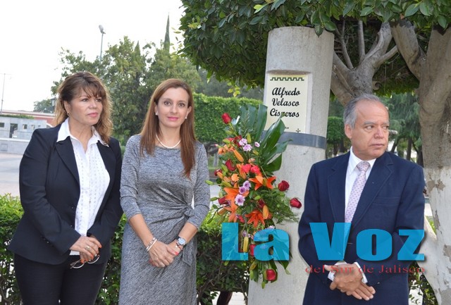 Para la parte final de la ceremonia, la presidenta municipal, junto con la regidora Eva Manríquez y el escritor Fernando Vázquez, colocaron una ofrenda floral en el pilar que lleva su nombre en memoria del escritor Alfredo Velasco Cisneros.