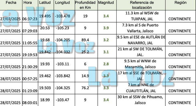 TUXPAN, JAL., (ES).- En un reporte emitido por la Unidad Estatal de Protección Civil y Bomberos informó que durante el domingo 27 y el lunes 28 de julio, se habían registrado 8 sismos en de baja magnitud en territorio continental.
