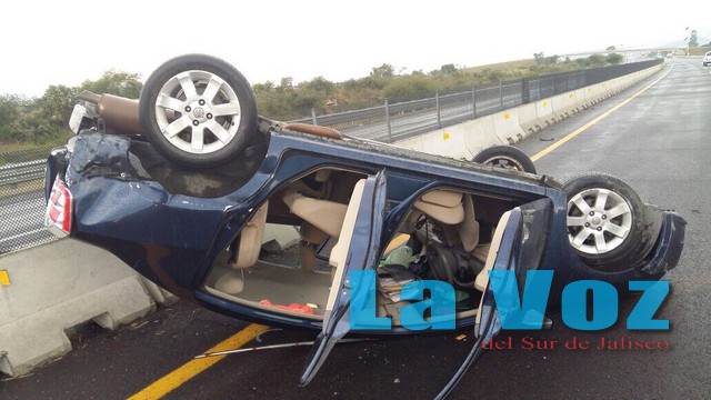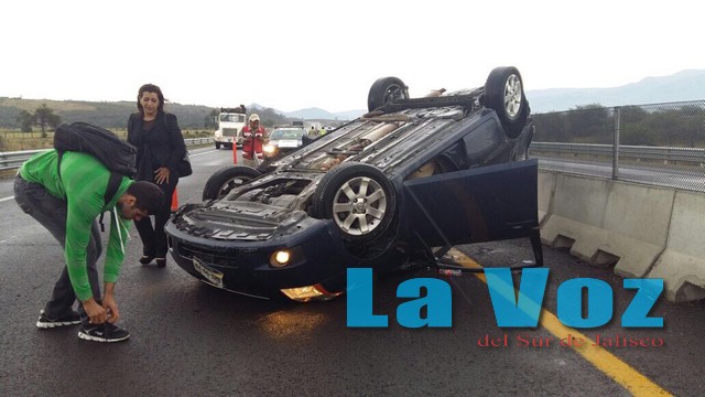 En el kilómetro 72 un auto compacto en color azul con placas de circulación del estado de Jalisco, debido al exceso de velocidad con el que era conducido, se impactó de manera violenta contra la barrera central que divide la pista y luego se volcó quedando sobre su toldo.
