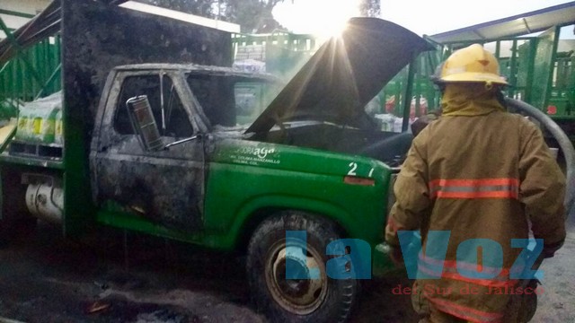 CIUDAD GUZMÁN, JAL., (ES).- Un corto circuito provocó que el fuego se hiciera presente en la cabina de una camioneta perteneciente a una empresa refresquera, en el ingreso sur a Ciudad Guzmán.