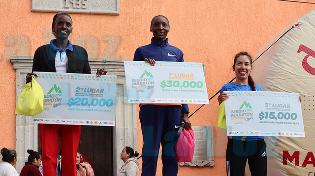 Y en la categoría femenil la triunfadora fue Risper Biyaki Gebsawa con 1 hora 15 minutos 23 segundos, mientras que Leah Jebiwot Kigen y María del Socorro Álvarez completaron el podio registrando un tiempo de 1 hora con 16 minutos y 3 segundos y 1 hora con 18 minutos y 10 segundos, respectivamente.