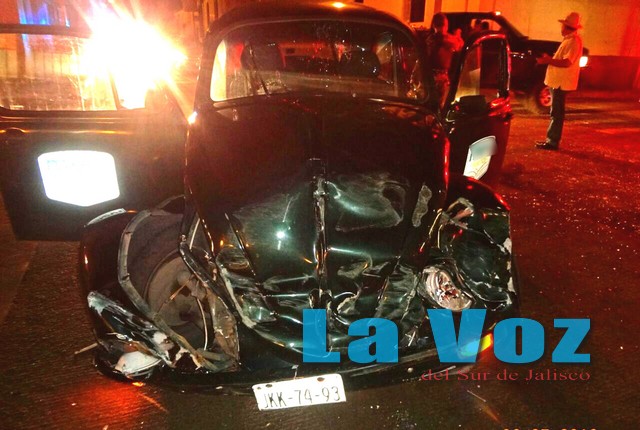 CIUDAD GUZMÁN, JAL., (ES).- La madrugada del domingo 26 de junio, en los cruces de las calles Hidalgo y Victoria, los ocupantes de un vehículo Volkswagen tipo vocho se impactaron contra un camioneta que circulaba de sur a norte.