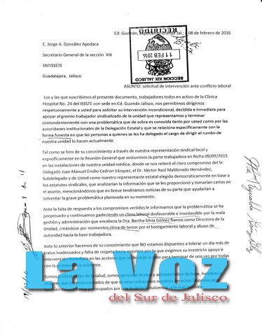 El oficio fue remitido a Jorge González Apodaca, secretario general de la Sección XIX del Sindicato del ISSSTE, y reúne nombres, firmas y número de empleado del personal de base que manifiesta su apoyo para destituir a las autoridades del hospital guzmanense.