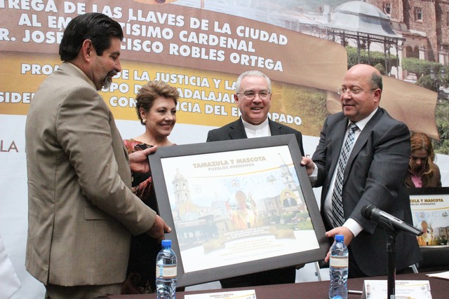 Los municipios de Tamazula de Gordiano y Mascota suscribieron convenio de hermanamiento, cuya finalidad primordial será el trabajo conjunto para beneficio de los ciudadanos de ambas entidades. En el acto, que se llevó a cabo el viernes 31 de enero en el patio central de la presidencia municipal de Tamazula, el alcalde Francisco Javier Alvarez Chávez dijo que este hermanamiento se da con un municipio que tiene un gran liderazgo, por lo que elogió el trabajo del presidente municipal de Mascota, ingeniero Miguel Castillón López. ¨Reconozco, con alto honor y con acrecentado sentimiento de gratitud, que este hermanamiento sea testificado y avalado por ciudadanos prominentes de nuestros municipios, entre los cuales destaca como el Mascotense, Jalisciense y Mexicano Ilustre, Dignísimo Arzobispo de Guadalajara, Eminentísimo Señor Cardenal Don José Francisco Robles Ortega, a quien en nombre propio y del gobierno de Tamazula, presento el puntual respeto y cariño que nos inspira su obra apostólica. Así mismo, expreso especial gratitud a la Señora María del Sagrario Díaz de Sandoval, tamazulense predilecta, porque alienta nuestros esfuerzos para promover el desarrollo intermunicipal, en beneficio la sociedad más vulnerable de Jalisco¨, dijo el maestro Francisco Javier Alvarez. ¨En la presente Administración Pública Municipal, que me honro en presidir, hermanamos a Tamazula con Ciudad Guzmán, pueblo muy cercano en geografía, identidad y en aprecio. Hoy lo hacemos con Mascota, demostrando que no existen fronteras que impidan un acercamiento de colaboración y de respeto, porque nuestros ciudadanos son gente que se caracteriza por su apertura para ampliar la amistad y la colaboración¨. El acto contó con la asistencia de la señora María del Sagrario Díaz de Sandoval, tamazulense predilecta; así como destacados vecinos oriundos de Mascota, como Roberto Dávalos López, Secretario de Infraestructura y Obra Pública, representante del Sr. Gobernador, Mtro. Jorge Aristóteles Sandoval Díaz; Dr. Felipe de Jesús Álvarez Cibrián, Presidente de la Comisión Estatal de Derechos Humanos; y en forma, especial, la Sra. Teresa Ortega de Robles, madre del Sr. Cardenal Don José Francisco Robles Ortega, personaje que recibió las llaves de la Ciudad de Tamazula de Gordiano y que fungió como testigo de honor.