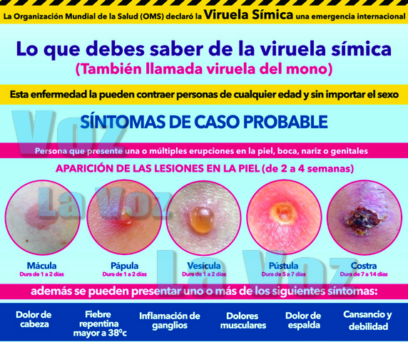 De acuerdo con datos de la Organización Panamericana de la Salud (OPS), la viruela símica se presenta principalmente en África central y occidental, a menudo cerca de selvas tropicales, aunque su presencia está aumentando en las zonas urbanas. Entre los hospedadores animales se incluyen una variedad de roedores y primates. SÍNTOMAS Las manifestaciones de la viruela símica suelen incluir: *Fiebre * Dolor de cabeza intenso * Dolores musculares * Dolor de espalda * Poca energía * Ganglios linfáticos inflamados * Erupción cutánea o lesiones. La erupción suele comenzar entre uno y tres días después del inicio de la fiebre y dolor. Las lesiones pueden ser planas o ligeramente elevadas, llenas de líquido claro o amarillento, y luego pueden formar una costra, secarse y caerse. La enfermedad tiene un periodo de incubación de 5 a 21 días.